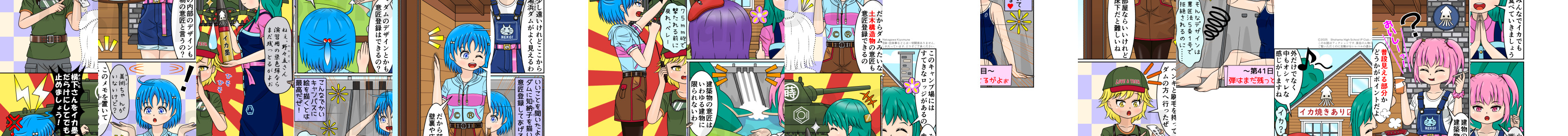 合宿中も美術(みすべ)は相変わらずイラストに夢中です。無断で知納子(ちなこ)を描いたダムの意匠は意匠法5条1号所定の公序良俗違反として意匠登録はできません……。また、刑法260条所定の建造物等損壊罪に問われるおそれがあります!